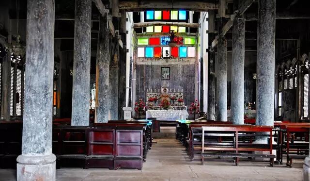 教堂是石木结构,四壁是木质菱形的通风墙体,通透的彩色玻璃窗,挂着耶稣故事的画框。