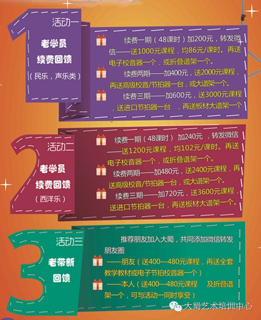 推荐新朋友加入大蜀,新老学员均可获得400-480元课程,以及教材、谱架、校音器等好礼。
